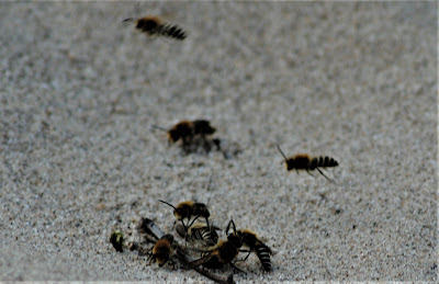 Also some critters on the walk through Crawley woods to the beach. Small copper butterflies (Lycaena philaeus); Eristalis arbustorum; and Drone fly (Eristalis tenax). There was much activity by bees burrowing in the dunes. The bee itself (Dasypoda altercator) is shown competing in a group and alone. A collection of tunnels is also shown in the side of a dune. Other Hymenoptera were evident in a digger wasp (Ammophila sabulosa) and Marble galls of Andricus kolleri. On the beach itself was a Brittle star (Ophiothrix fragilis).