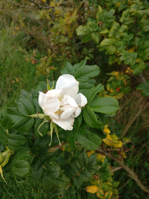 Did a 6 k circuit from Loughor to Gorseinon and back. More flowers still evident. Noted Red clover (Trifolium pratense); White clover (Trifolium repens); Butterfly bush (Buddleja davidii); Field rose (Rosa arvense); Honeysuckle (Lonicera periclymenum); Orange hawkweed (Hieracium auranticum); French cranesbill (Geranium endressii); Marsh willowherb (Epilobium palustre); Bramble (Rosa fructicosus); Japanese knotweed (Reynoutria japonica); Ragwort (Senecio jacobaea); Dovesfoot cranesbill (Geranium molle); Wild raddish (Raphanus raphanistrum); Saw wort (Serratula tinctoria) and Herb Robert (Geranium robertianum). There were also items in fruit including alien Snowberry (Symphoricarpos albus); Sea buckthorn (Hippophae rhamnoides); Pedunculate oak (Quercus robur) and Sweet chestnut (Castanea sativa). A Red admiral butterfly (Vanessa atalanta) sunned itself on Bracken.